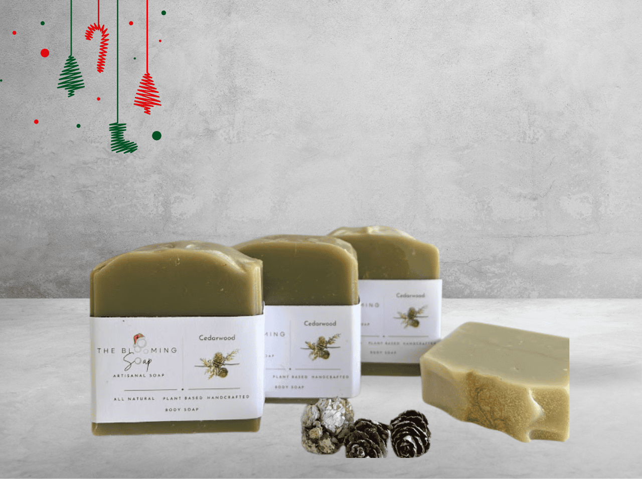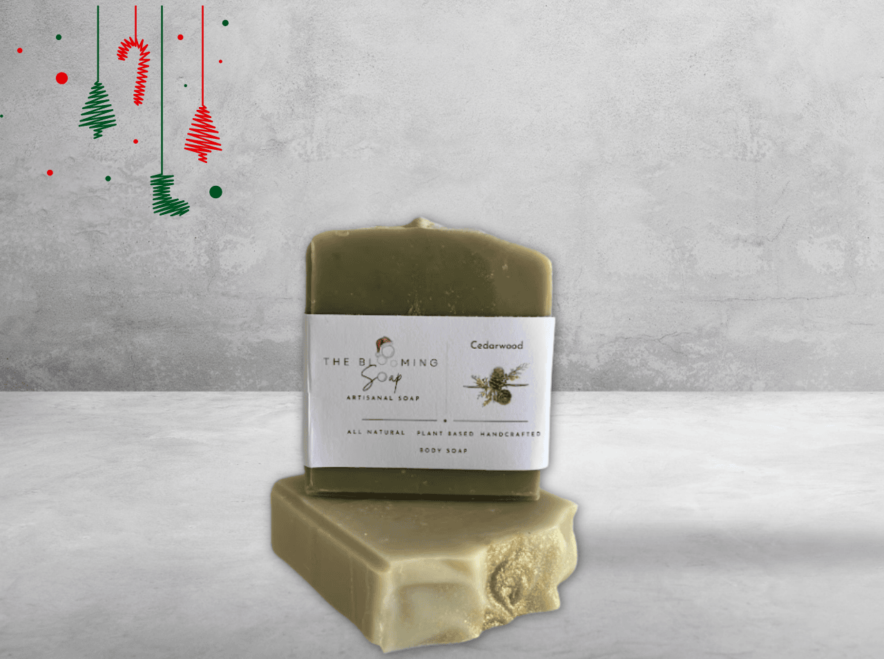 Our Cedarwood Soap is crafted with a rich blend of nourishing oils and butters, naturally colored with spirulina and green clay, and finished with a shimmering gold mica line for a touch of holiday magic. Scented with warm, woody Cedarwood essential oil.