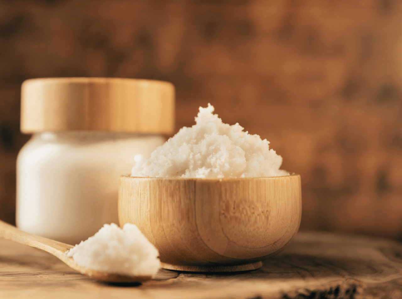Scoop a small amount of body butter using a wooden spoon and massage it into clean, dry skin.
