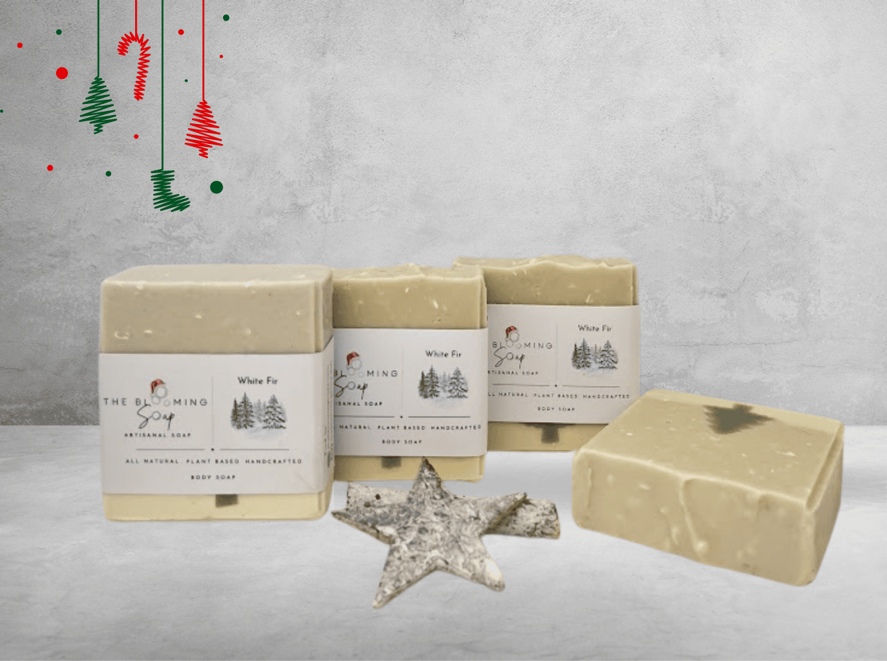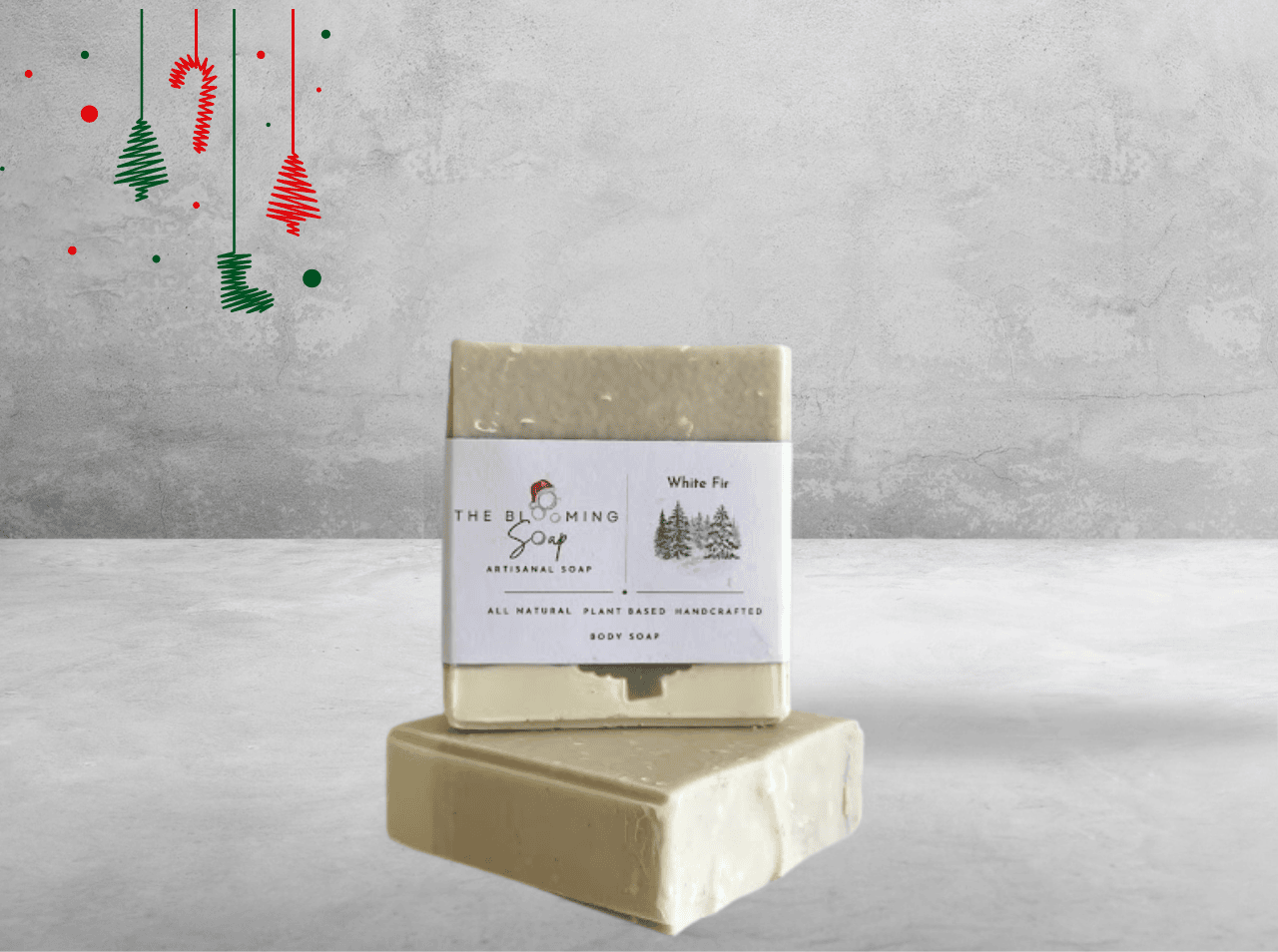 Our White Fir Soap is made with a luxurious blend of oils and butters, , using plant-based colors, to create a serene snowy landscape with a Christmas fir tree.